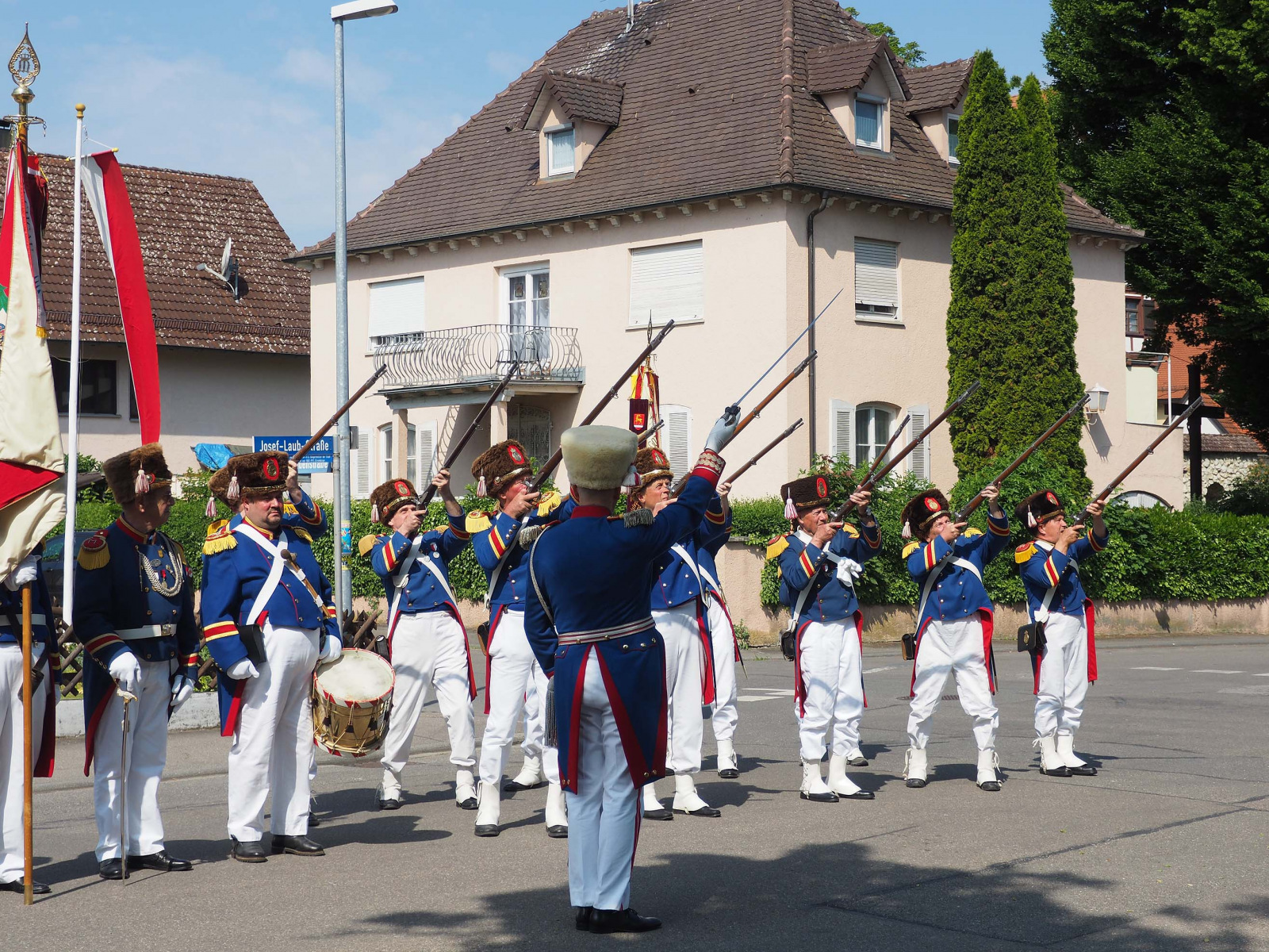Zusammen mit den Garden und Wehren aus Mittelbiberach, Dietenheim, Esslingen, Trochtelfingen, Bad Saulgau, Rottenburg, Ehingen, Munderkingen, Crailsheim, Schwäbisch Hall, Lauchheim, Sigmaringen, Hüttlingen, Hechingen, Waldburg, Ochsenhausen und Riedlingen haben wir das historische Bürgerwehrwesen im Landesverband beim Großen Zapfenstreich und beim Festumzug mit beiden Fahnenrotten vertreten.