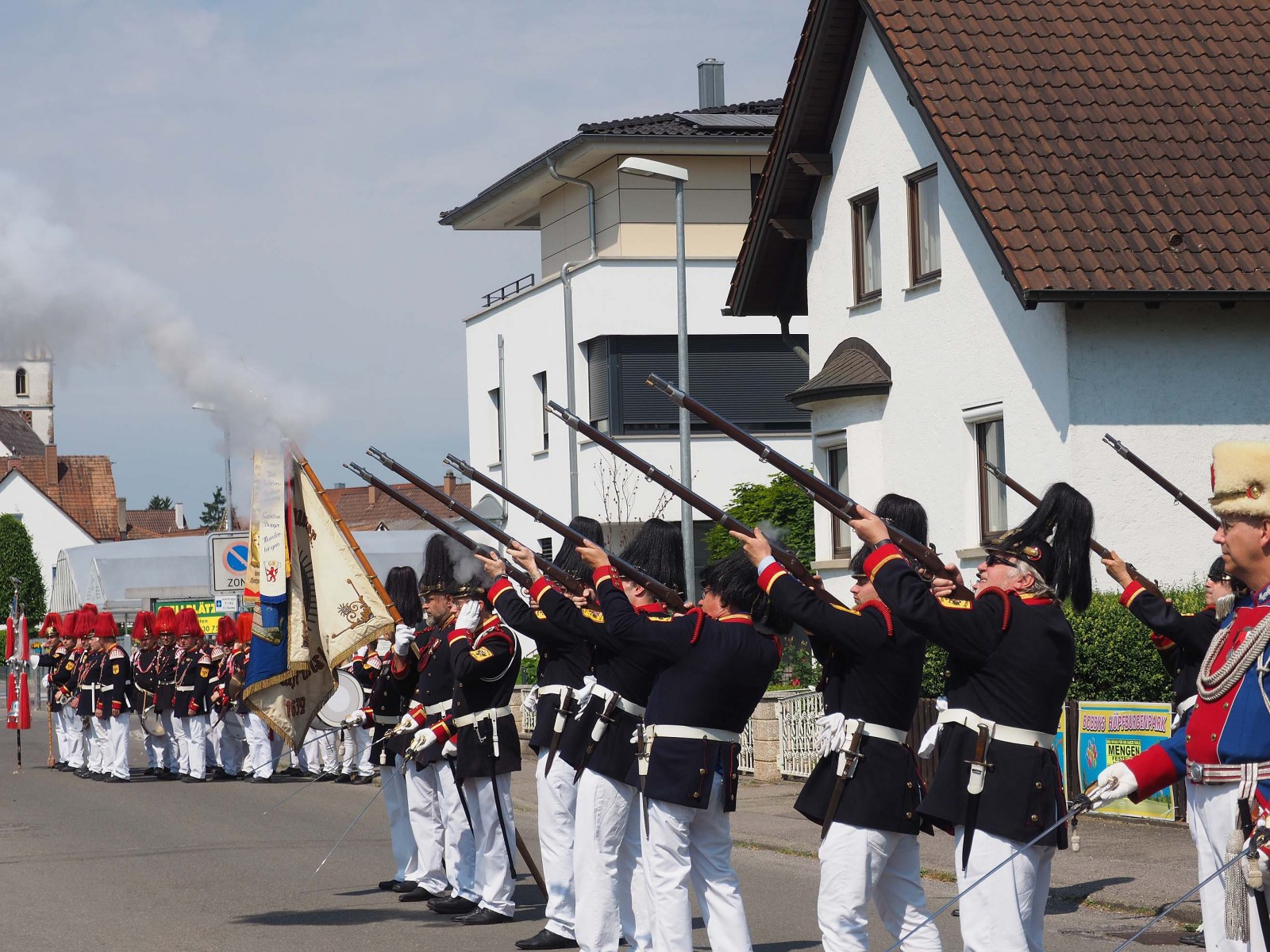 Zusammen mit den Garden und Wehren aus Mittelbiberach, Dietenheim, Esslingen, Trochtelfingen, Bad Saulgau, Rottenburg, Ehingen, Munderkingen, Crailsheim, Schwäbisch Hall, Lauchheim, Sigmaringen, Hüttlingen, Hechingen, Waldburg, Ochsenhausen und Riedlingen haben wir das historische Bürgerwehrwesen im Landesverband beim Großen Zapfenstreich und beim Festumzug mit beiden Fahnenrotten vertreten.