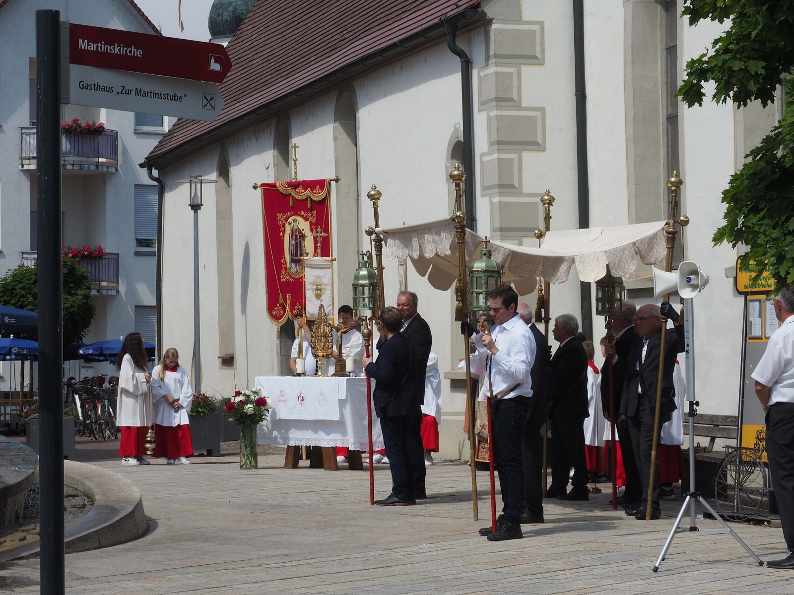 Im Anschluss an die Prozession durch die Stadt hat die Bürgerwache auf dem Platz vor dem Vereinsheim und der Martinskirche zu einem gemütlichen Beisammensein bei Frühschoppen und Mittagessen eingeladen. Für viele Bürgerinnen und Bürger der Stadt und dem Umland war dies mit ein Zeichen, ihre Verbundenheit mit der Wehr zu bezeugen. Frühsommerliches Wetter tat sein Übriges dazu, dass alle Plätze rasch besetzt waren und noch zusätzlich Tische und Bänke aufgestellt werden mussten. Durchreisende Radfahrerinnen und Radfahrer nutzten ebenfalls die Gelegenheit, sich von der Gardeküche mit vorzüglichen Speisen und Getränken für die Weiterfahrt auf dem Donau-Radwanderweg zu stärken, und sich vom Musikzug unterhalten zu lassen. Alles in allem wieder ein erfolgreiches Fest.