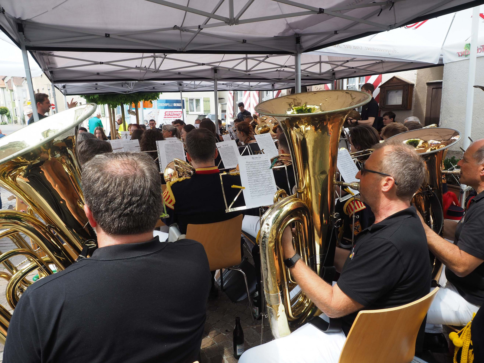Im Anschluss an das Gedenken der Verstorbenen zogen die Uniformierten Richtung Festzelt. Dort hatte unser Musikzug bereits die Plätze auf der Tribüne eingenommen und unterhielt die Gäste zum Frühschoppen und Mittagessen.