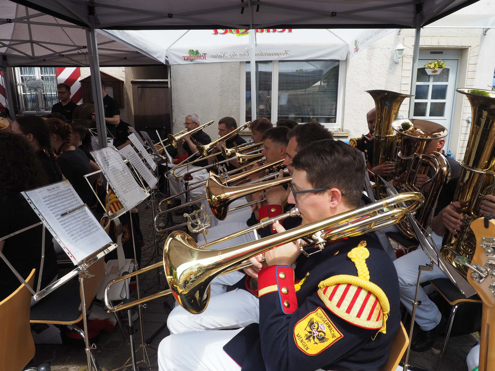 Im Anschluss an das Gedenken der Verstorbenen zogen die Uniformierten Richtung Festzelt. Dort hatte unser Musikzug bereits die Plätze auf der Tribüne eingenommen und unterhielt die Gäste zum Frühschoppen und Mittagessen.