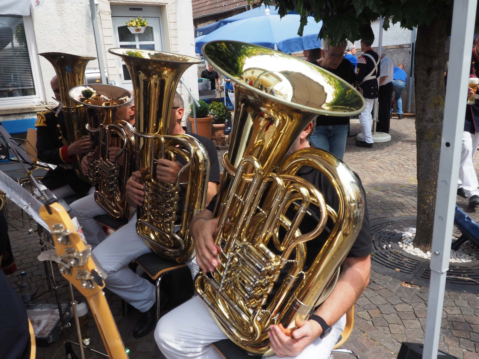 Im Anschluss an das Gedenken der Verstorbenen zogen die Uniformierten Richtung Festzelt. Dort hatte unser Musikzug bereits die Plätze auf der Tribüne eingenommen und unterhielt die Gäste zum Frühschoppen und Mittagessen.