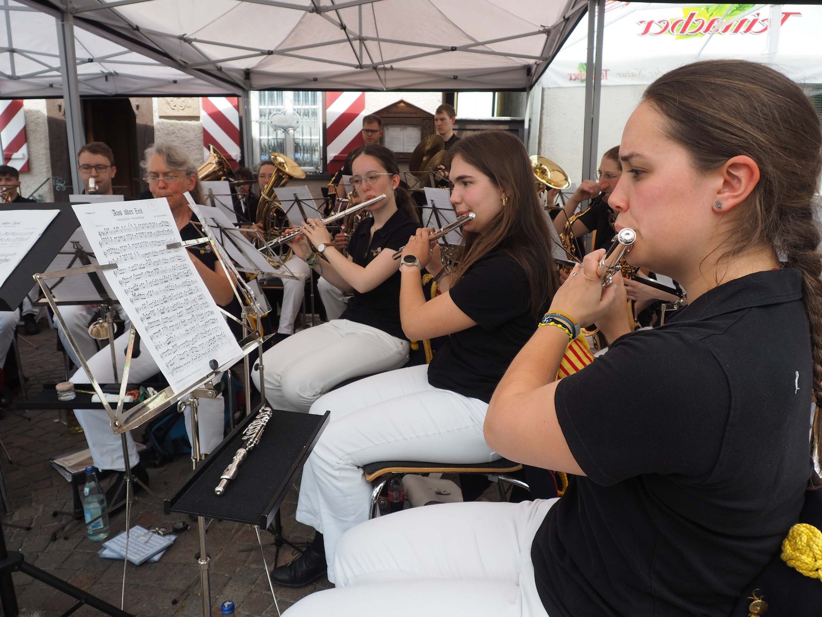 Im Anschluss an das Gedenken der Verstorbenen zogen die Uniformierten Richtung Festzelt. Dort hatte unser Musikzug bereits die Plätze auf der Tribüne eingenommen und unterhielt die Gäste zum Frühschoppen und Mittagessen.
