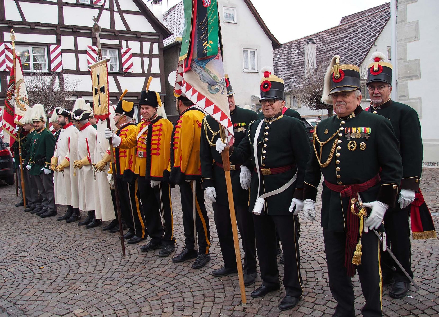 Nach zwei Jahren Zwangspause hat die Bürgerwache in diesem Jahr wieder ihren Jahrtag am dritten Samstag im Januar und in traditioneller Form begangen. Vor dem Bürgerwachheim hatten sich Kameraden benachbarter Garden und Wehren aus Bad Saulgau, Sigmaringen, Altshausen, Munderkingen und Ehingen eingefunden. Die Schützenkompanie aus Schlanders/Göflan in Südtirol war mit Josef und Martin Wielander vertreten. Das gemeinsame Feiern des Jahrtags mit den Mengener Kameraden war ihnen der weite Weg über die Alpen wert.