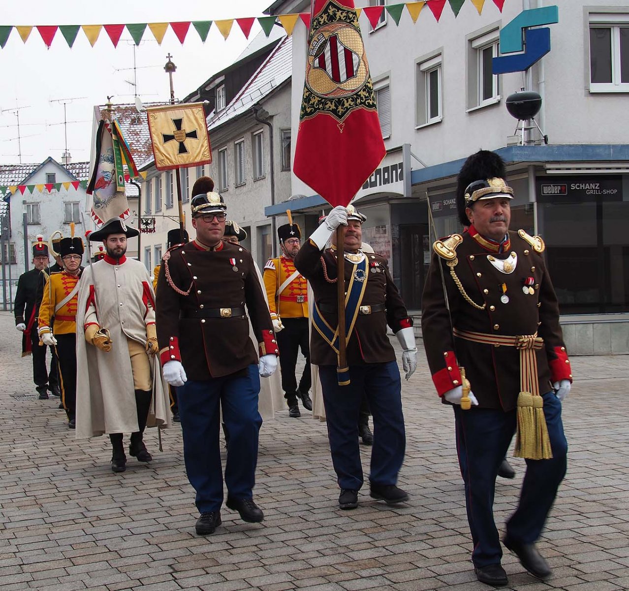 Zusammen mit den Garden und Wehren aus Mittelbiberach, Dietenheim, Esslingen, Trochtelfingen, Bad Saulgau, Rottenburg, Ehingen, Munderkingen, Crailsheim, Schwäbisch Hall, Lauchheim, Sigmaringen, Hüttlingen, Hechingen, Waldburg, Ochsenhausen und Riedlingen haben wir das historische Bürgerwehrwesen im Landesverband beim Großen Zapfenstreich und beim Festumzug mit beiden Fahnenrotten vertreten.