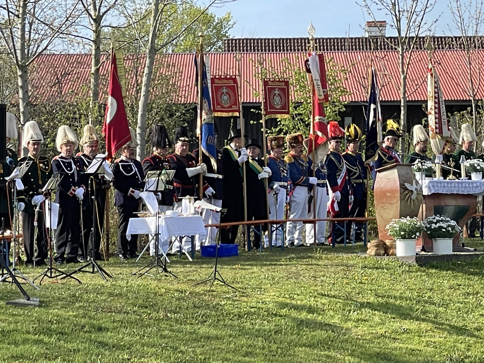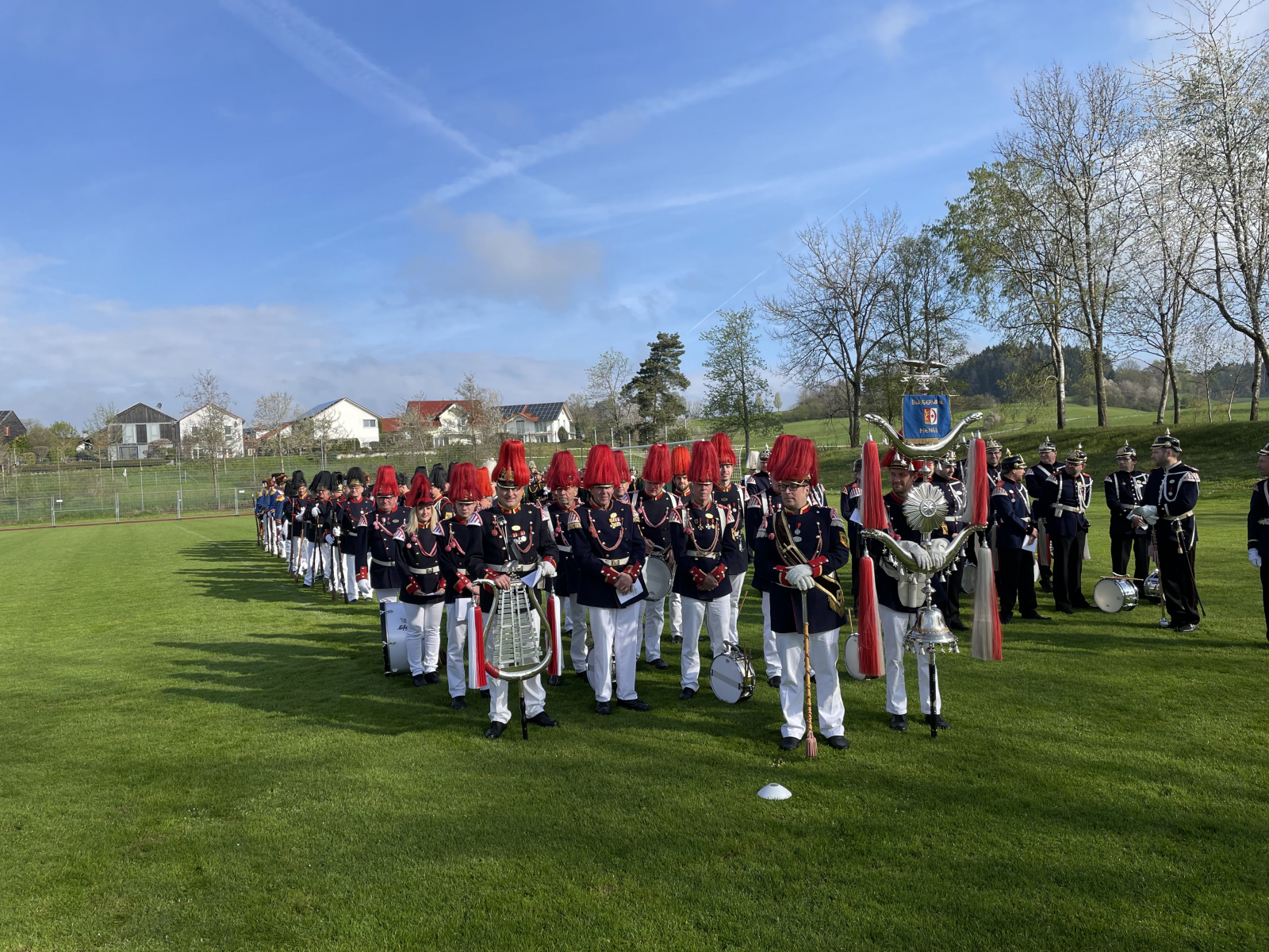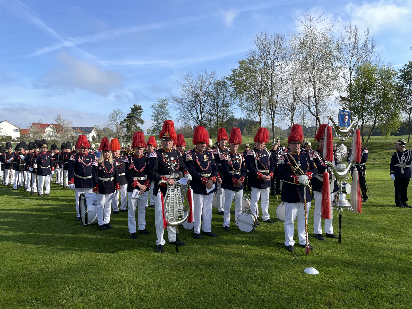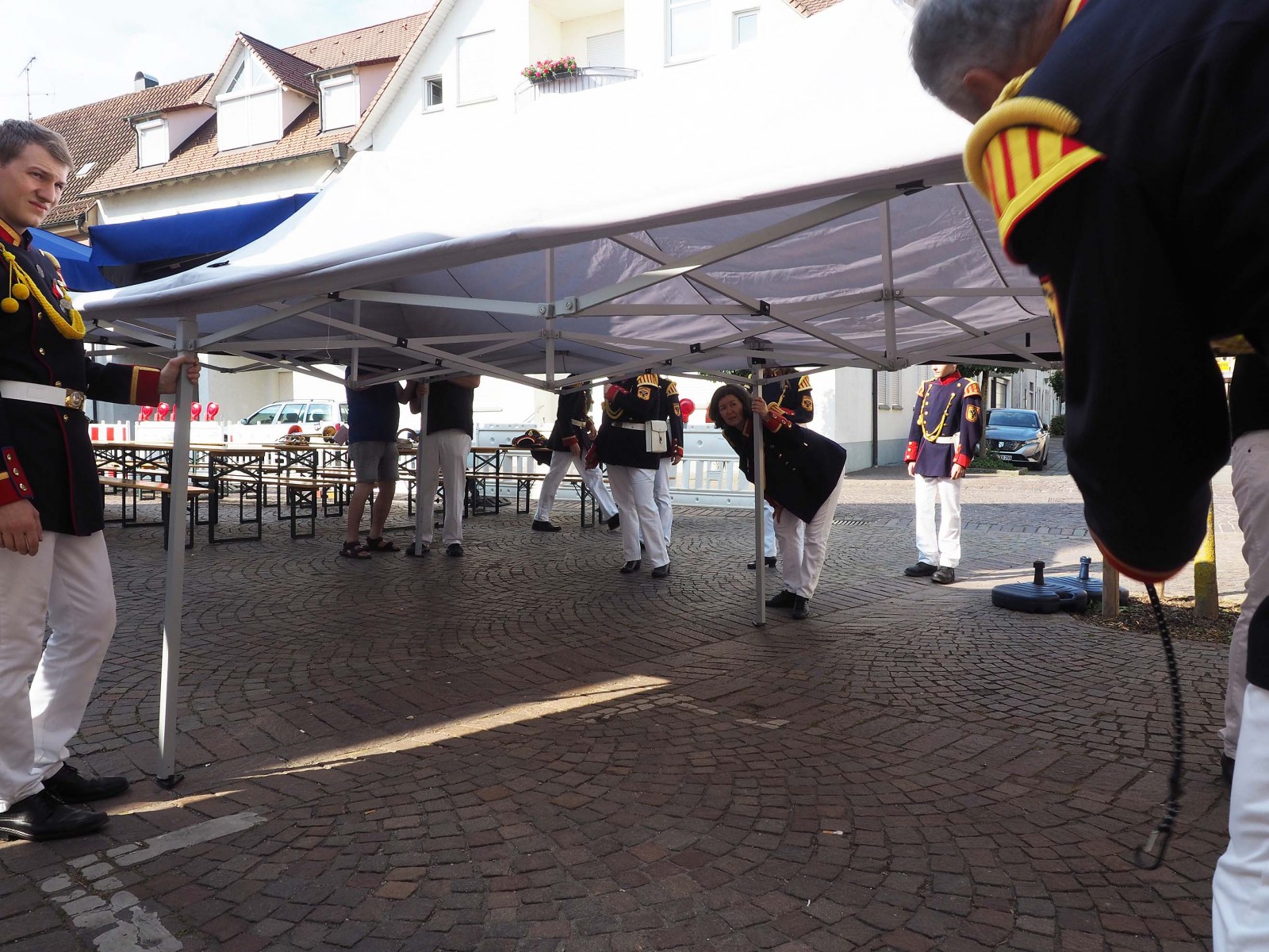 Im Anschluss an das Gedenken der Verstorbenen zogen die Uniformierten Richtung Festzelt. Dort hatte unser Musikzug bereits die Plätze auf der Tribüne eingenommen und unterhielt die Gäste zum Frühschoppen und Mittagessen.