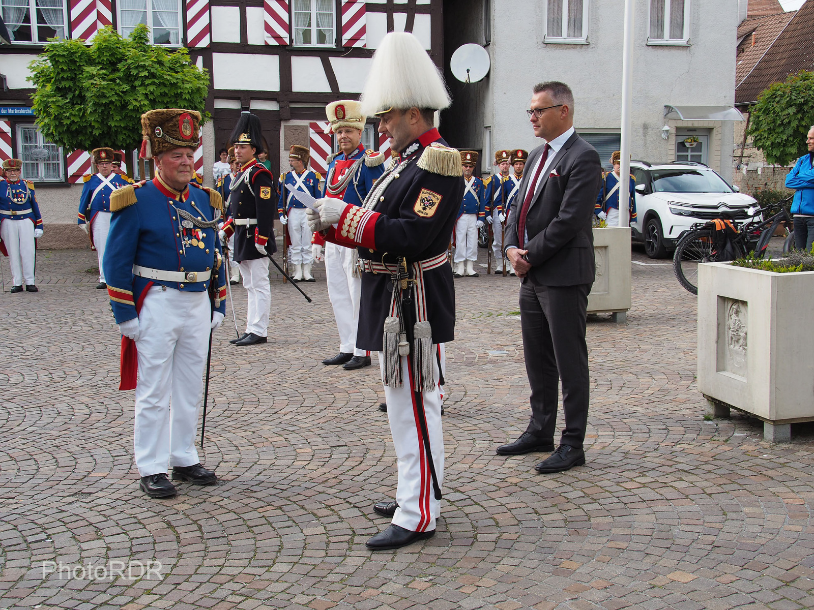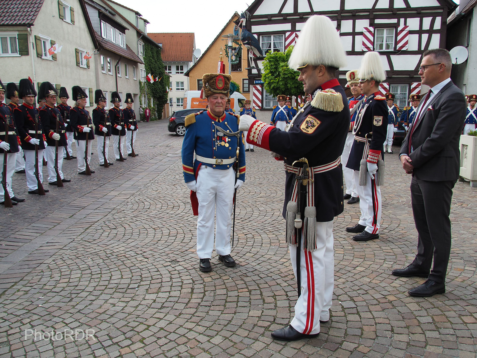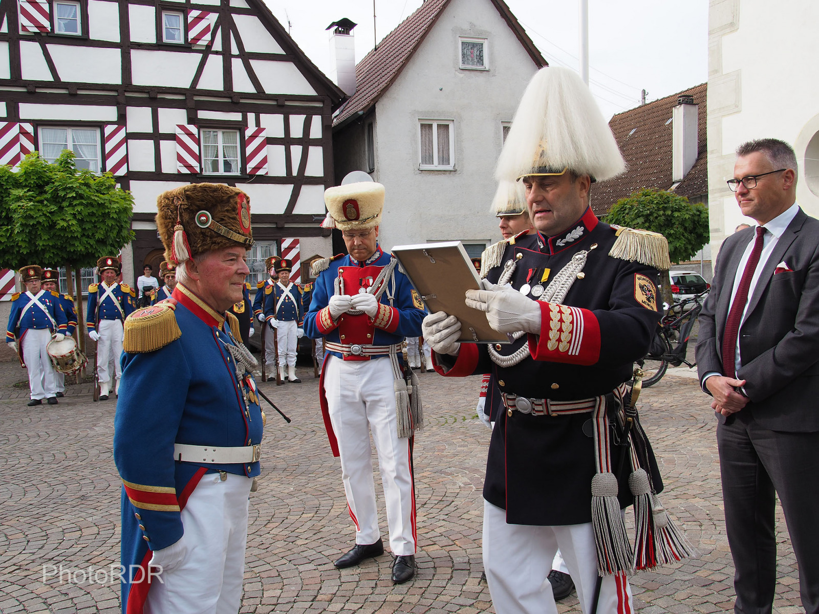 Beim Kommandantenempfang erhielt Prof.Dr. Urban Bacher für seine Zeit als Vorsitzender des Freundeskreises der historischen Bürgerwehren in Baden-Württemberg, und für seine Veröffentlichungen im „Bürger im Bunten Rock“ aus den Händen von S.K.H. Wilhelm Herzog von Württemberg die von dessen verstorbenem Großvater gestiftete Medaille ausgehändigt. Die Laudatio hielt Joachim Butz, Persönlicher Referent des Herzogs.
