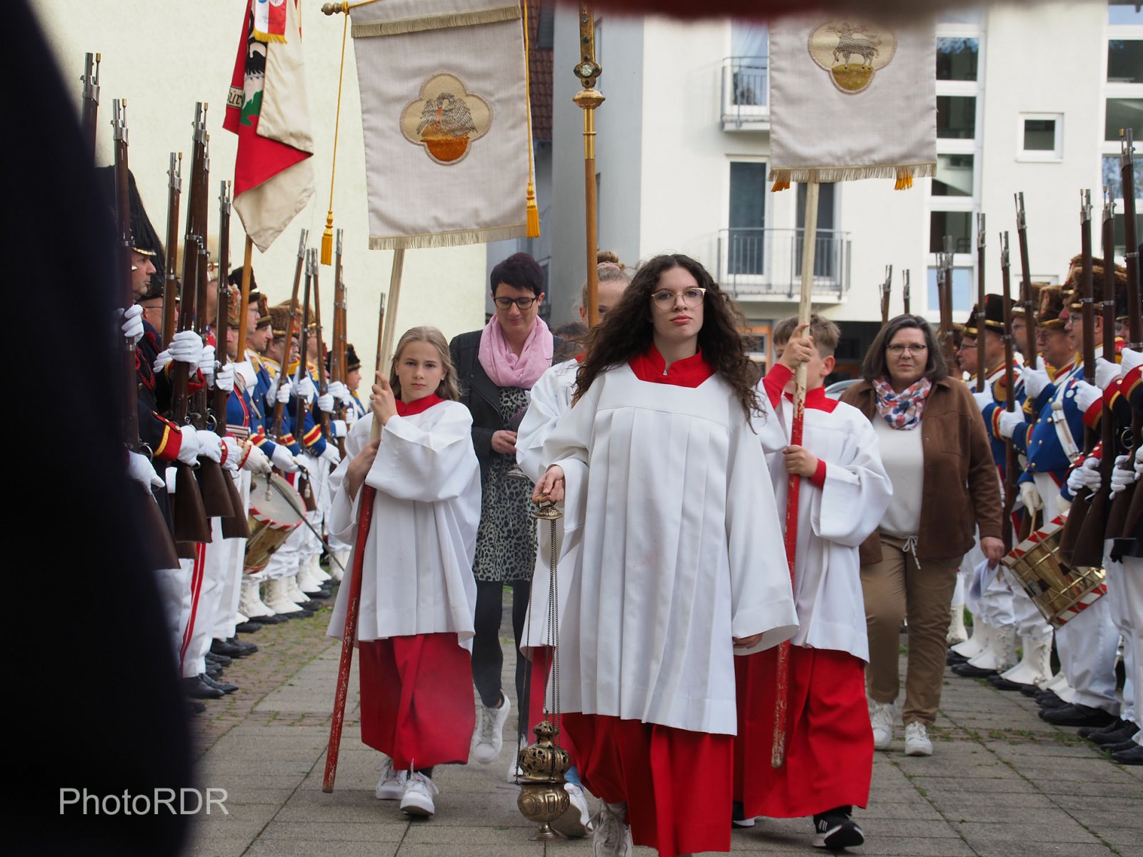 Zur großen Freude durfte der Feldkurat der Bürgerwache, Pfarrer i. R. und Dekan a. D. Heinz Leuze mal wieder in alleiniger Zelebration die Eucharistie feiern. Ihm assistierten Ministranten aus dem Spielmannszug. Den musikalischen Part erbrachte der Musikzug von der Orgelempore aus.