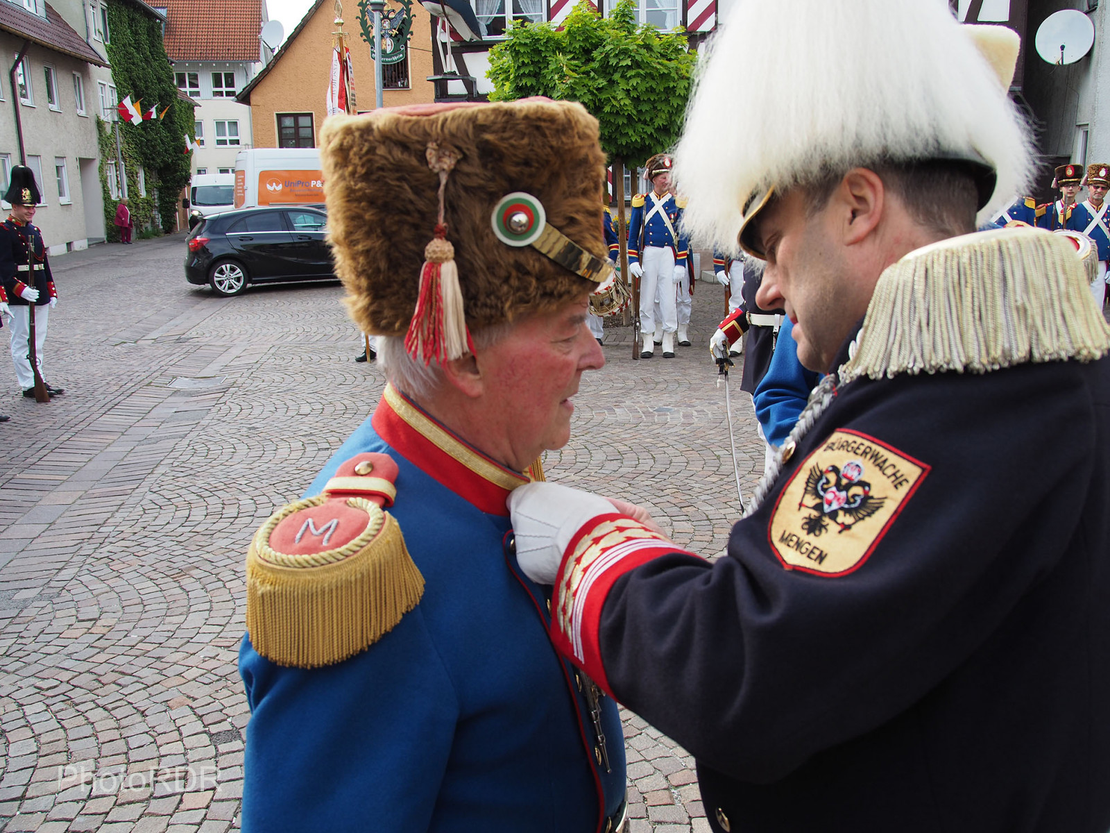 Etwas mehr an Zeit nahm die Ehrung der aktiven Gardisten, Musiker und Spielleute in Anspruch, denn Major Bacher hatte für Jede und Jeden Anekdoten parat. Seine eigene Ehrung für 50 Jahre im aktiven Dienst der Bürgerwache übernahm Hauptmann Josef Stocker von der Bürgerwache Ehingen als Mitglied des Beirats im Landeskommando.