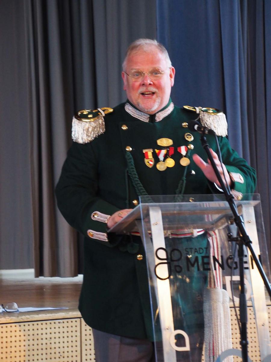 Zum Schluss der Rechenschaftsberichte sprach Leutnant Manfred H. Müller als Tutor des Bürgerwachchors. Insgesamt elf Proben und Auftritte habe der Chor vorzuweisen. Er bedankte sich bei den Sängerkameraden für deren Treue und vor allem beim Chorleiter Josef Grüner. Mit nur noch 16 Mann sei der Chor dringend auf Zuwachs angewiesen. Müller machte darauf aufmerksam, dass der Chor der Bürgerwache Mengen ein Unikat sei in ganz Deutschland. Keine andere historische Bürgerwehr habe einen eigenen Chor, und damit es so bleibe, brauche dieser unbedingt Verstärkung. Dem fügte Kommandant Bacher ebenfalls seinen Aufruf hinzu und gab seiner Freude Ausdruck, selbst im Chor zu singen.
