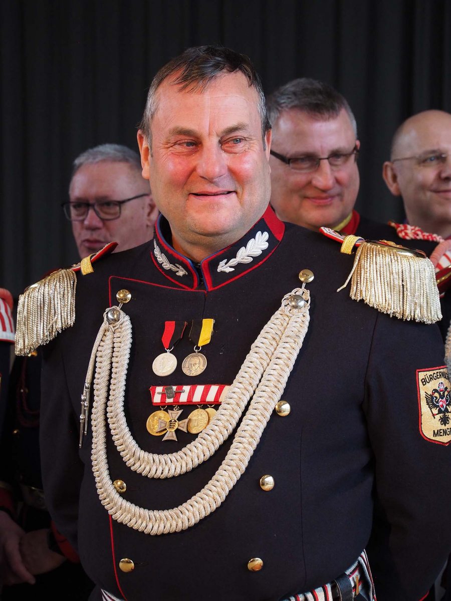 Zum Schluss der Rechenschaftsberichte sprach Leutnant Manfred H. Müller als Tutor des Bürgerwachchors. Insgesamt elf Proben und Auftritte habe der Chor vorzuweisen. Er bedankte sich bei den Sängerkameraden für deren Treue und vor allem beim Chorleiter Josef Grüner. Mit nur noch 16 Mann sei der Chor dringend auf Zuwachs angewiesen. Müller machte darauf aufmerksam, dass der Chor der Bürgerwache Mengen ein Unikat sei in ganz Deutschland. Keine andere historische Bürgerwehr habe einen eigenen Chor, und damit es so bleibe, brauche dieser unbedingt Verstärkung. Dem fügte Kommandant Bacher ebenfalls seinen Aufruf hinzu und gab seiner Freude Ausdruck, selbst im Chor zu singen.