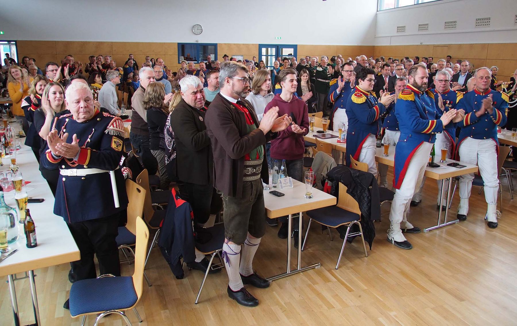 Im gut besetzten Bürgerhaus Ennetach begrüßte Major und Kommandant Georg Bacher neben den Aktiven, den passiven Mitgliedern, den Angehörigen von Verstorbenen und den Gästen aus der Bevölkerung auch eine ganze Reihe von Ehrengästen, die er namentlich willkommen hieß. Für die kulinarische Versorgung sorgte das Gastroteam der Bürger-wache mit ihrem Gardemetzger. Damit niemand auf Getränke und Essen warten musste, waren die emsigen Helferinnen und Helfer des FC Mengen ständig im Saal unterwegs.