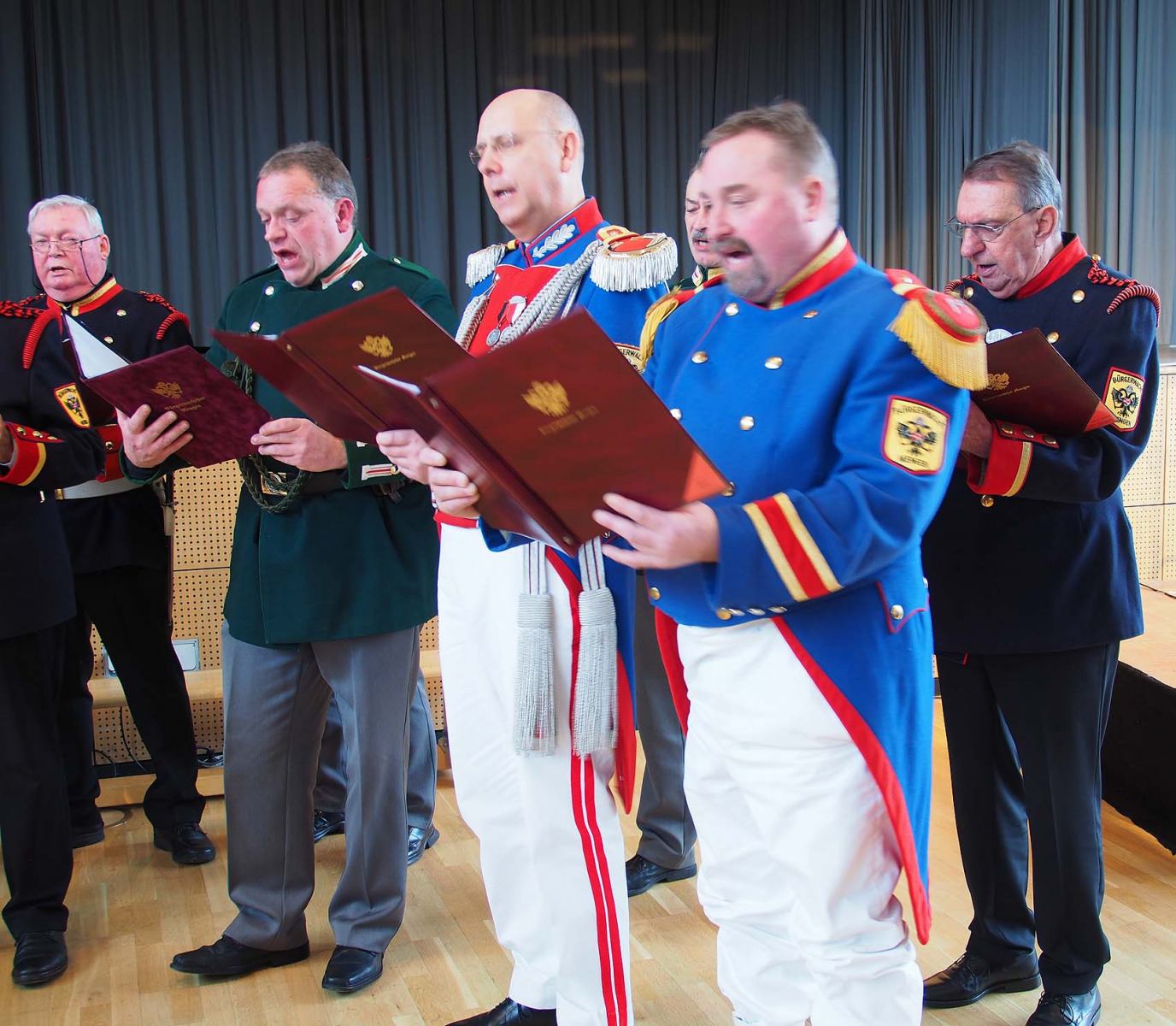 Zum Schluss der Rechenschaftsberichte sprach Leutnant Manfred H. Müller als Tutor des Bürgerwachchors. Insgesamt elf Proben und Auftritte habe der Chor vorzuweisen. Er bedankte sich bei den Sängerkameraden für deren Treue und vor allem beim Chorleiter Josef Grüner. Mit nur noch 16 Mann sei der Chor dringend auf Zuwachs angewiesen. Müller machte darauf aufmerksam, dass der Chor der Bürgerwache Mengen ein Unikat sei in ganz Deutschland. Keine andere historische Bürgerwehr habe einen eigenen Chor, und damit es so bleibe, brauche dieser unbedingt Verstärkung. Dem fügte Kommandant Bacher ebenfalls seinen Aufruf hinzu und gab seiner Freude Ausdruck, selbst im Chor zu singen.