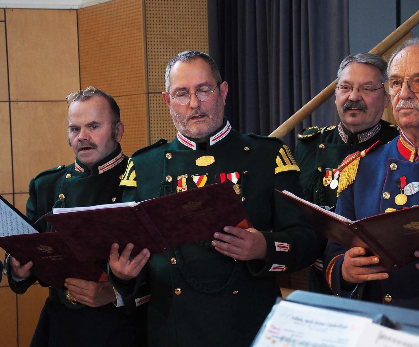 Viel Beifall gab es vom Publikum für die Mitteilung, dass der Bürgerwach-Chor Ver-stärkung aus den Reihen der Bürgerwache Saulgau bekommen hat. Armin Geiger, gebürtig aus Mengen, Spielmann in Saulgau und dort auch Leiter des Jugendspielmannszugs hatte bei der Feier seines 60. Geburtstags vor wenigen Wochen kräftig die Werbetrommel gerührt, nachdem ihm dort der Chor mit einem Auftritt im Stadtforum gratuliert hatte. Er war bisher der Einzige, der im Chor im grünen Waffenrock der Bürgerwache Saulgau mitgesungen hatte. Chorleiter Josef Grüner gab über den Zuwachs seiner Freude vor dem Auftritt Ausdruck.