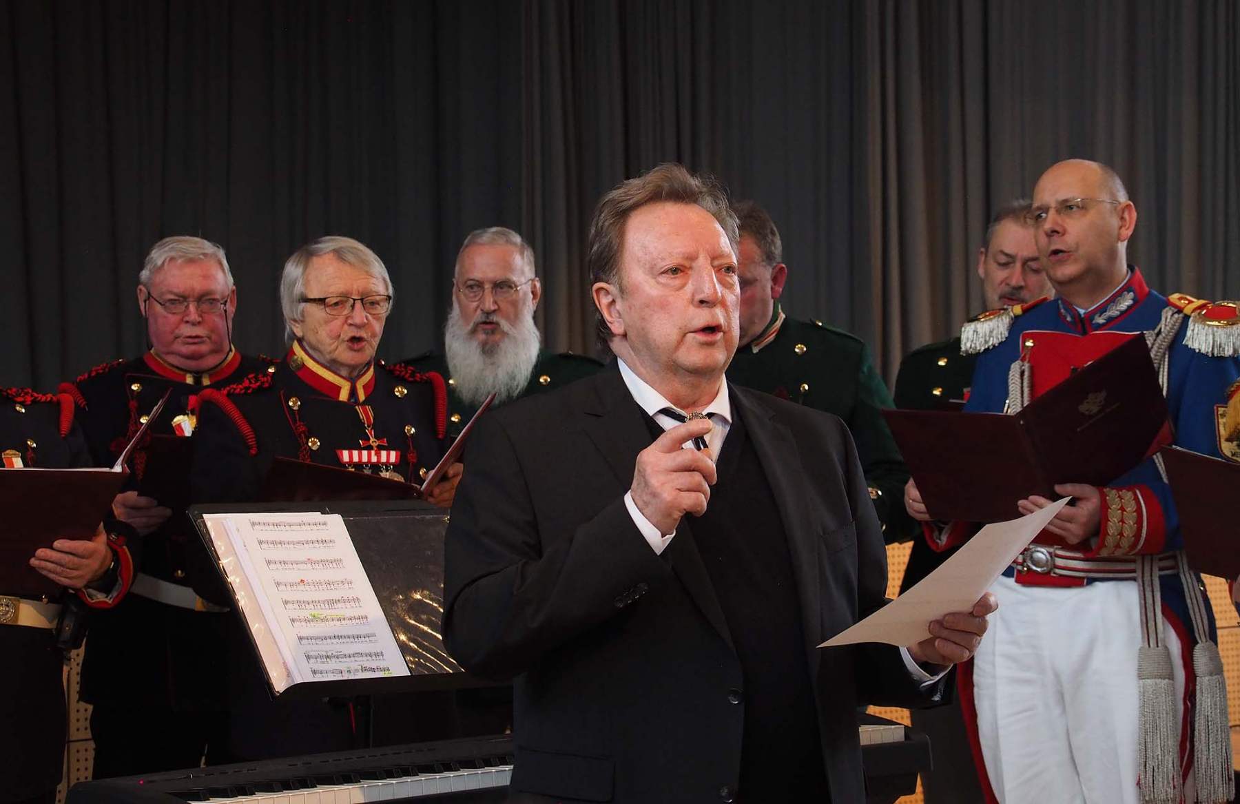 Viel Beifall gab es vom Publikum für die Mitteilung, dass der Bürgerwach-Chor Ver-stärkung aus den Reihen der Bürgerwache Saulgau bekommen hat. Armin Geiger, gebürtig aus Mengen, Spielmann in Saulgau und dort auch Leiter des Jugendspielmannszugs hatte bei der Feier seines 60. Geburtstags vor wenigen Wochen kräftig die Werbetrommel gerührt, nachdem ihm dort der Chor mit einem Auftritt im Stadtforum gratuliert hatte. Er war bisher der Einzige, der im Chor im grünen Waffenrock der Bürgerwache Saulgau mitgesungen hatte. Chorleiter Josef Grüner gab über den Zuwachs seiner Freude vor dem Auftritt Ausdruck.